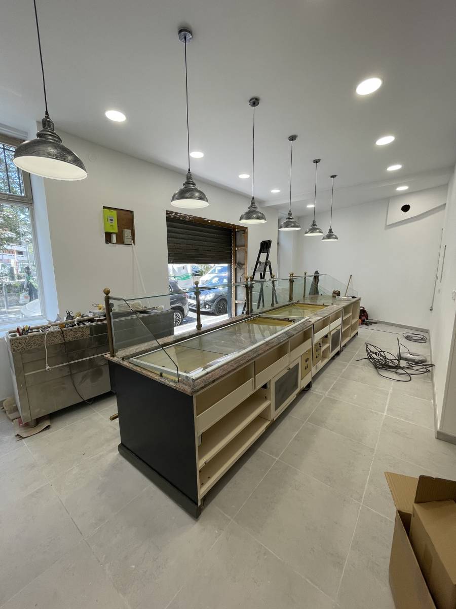 électricité : la pose et fourniture de LED encastrables au plafond , tirage d'une ligne électrique et raccordement électrique de nouvelles vitrines réfrigérées .Egalement la pose de dalles lumineuses dans le laboratoire et le tirage d'une ligne électrique triphasée pour four ventilé avec pose d'un disjoncteur triphasé. Enfin la pose de luminaires suspendus au dessus des vitrines du magasin .